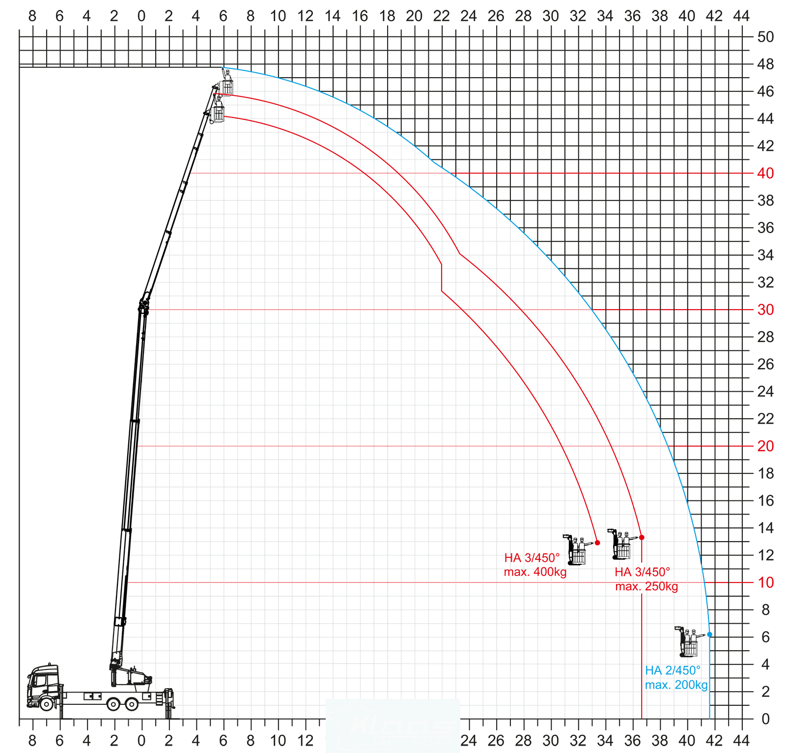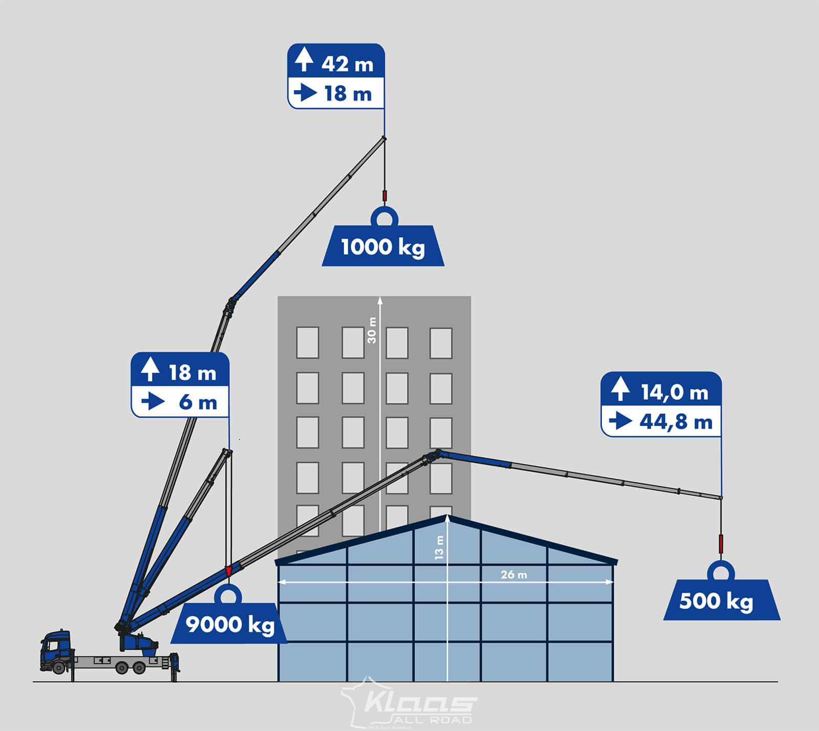 Avec ses vérins de stabilisation robustes, ses doubles poutres horizontales télescopiques et une largeur maximale de déploiement de seulement 7,34 mètres, le K2350 s’impose comme le partenaire idéal, même dans les centres-villes les plus exigus.